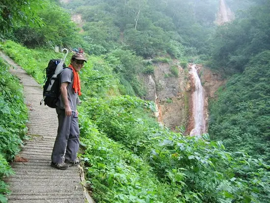 7月30日(土)朝、眠い眼を擦りながら、妙高高原ICを出て、燕温泉入口に駐車。08:25駐車場を出発。燕温泉という名前だけあって、上空には岩つばめが飛び回っている。こぢんまりした温泉街を通り抜ける。妙高山への登山ルートは、「妙仙橋」という吊り橋を渡って北地獄谷の北側尾根を登るルートと北地獄谷の南側を谷沿いに登るルートの2本がある。ところが、北側尾根ルートは、吊り橋が落ちていて通行止めになっている。そこで選択の余地無く、南側のルートに入る。登り始めてすぐに「黄金の湯」が現れる。これも露天風呂であるが、管理が行き届いており野趣には欠ける。ここで入湯したら、山へ登りたくなくなるような気がして、下山後入湯することとし先へ進む。天気は曇りで何とか行けそう。