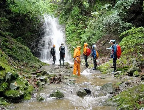 すぐに出会う10mの滝は、ロープを使い滝の右側を登っりました。そして次の20mの滝。