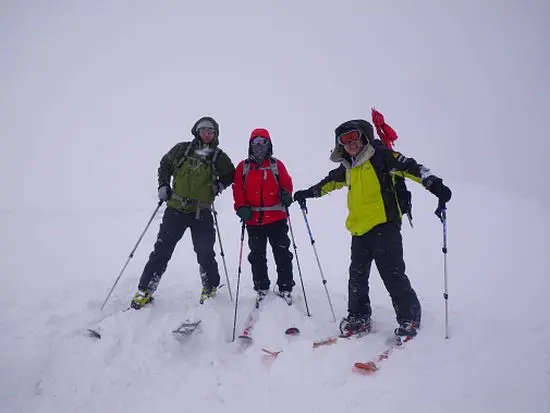 ルートは特に危険な所もなく、2時間ほどで放山の頂上に着いた。頂上は結構広くなだらかだ。ビールで乾杯したあと、食事を取っていると、4人組みのスキーヤーが上ってきた。ラッセルをしてもらったと礼を言っている。せっかくなので、写真を撮ってもらった。