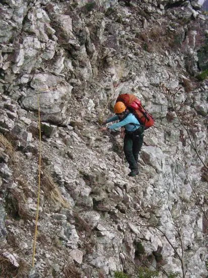 3ピッチ目は容易で、傾斜のない細いリッジを辿り右へ数メートル登ればビレイポイントに着く、20m程度。P5へ上がるにはここから直上しなければならないがとても登れそうにない。ルートはボロボロで浮石だらけのP5側壁をトラバースするようになっている。ビレイポイントは頼りない浅打ちのハーケン1本だけなので、ハーケン2本を打ち足して補強する。1本は回収不能となってしまったので残置した。ルートは数メートル下ってからトラバースするようになっている。こういう所はトップで行くのが一番安全だ。何だか少し狡いかなと内心思いながら自分がトップで行く。古くて腐ったようなフィックスがあるが、とてもこれに頼る気にはなれない。下り終わってトラバースに入るとホッと一息つける。真新しい残置のハーケンがあったが足元より下に打ってあるので使用できなかった。途中でハーケンを1本打ち、フレンズをセットできる所があったので2番を1個セットする。終点には太い木があるのでビレイポイントとしては申し分ない。