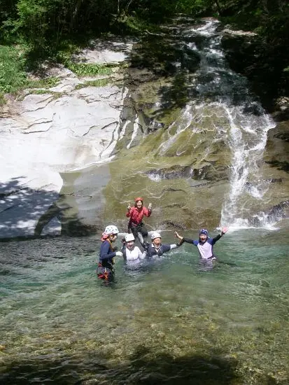 両門ノ滝で記念撮影  鶏冠谷出合の先から左岸の巻き道を登っていく(前回来た時には間違えてここから遡行を始めてしまったが、泳ぎあり、ジャンプありのパワー系の楽しいコースだった。体力の余っている人にはお勧めだ)。しかし巻き道もところどころで崩壊しており、ルートを探すのも一苦労である。無理して早めに上流側へトラバースしようとせず、いったん上を目指して行くのが安全なようだ。