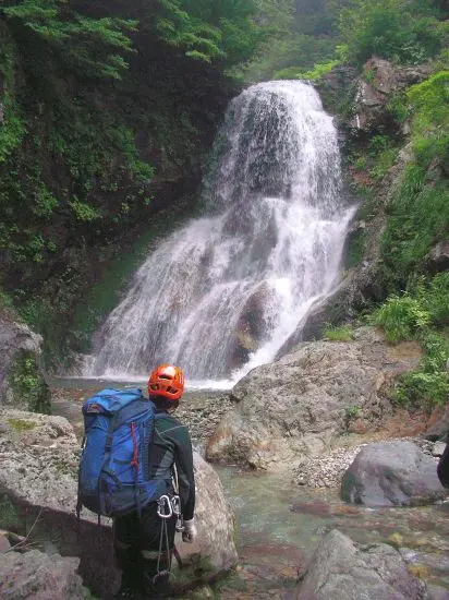 6時出発。本流を1時間弱で大鷲倉沢出合に着く。大鷲倉沢の水量は本流とほぼ同じ、大岩が門番のように両岸に構えている。ゴーロ帯を10分ほど行くと小鷲倉沢出合となる。小鷲倉沢を分けると直ぐにゴルジュの中の滝場が始まる。最初の滝は2段6m、これを越えて3~4mの小滝をいくつか登ると釜を持った3mのハングした滝となる。これは登れず左岸の草付きから捲く。草しか生えていない斜面なので捲きは嫌らしい。