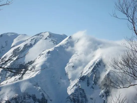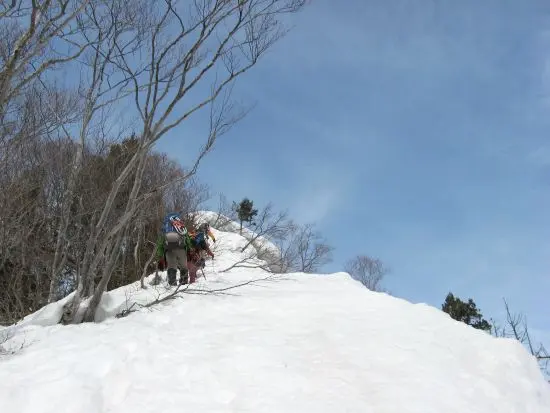 林道を30分ほど歩いた貯水池の左側の杉林から尾根に取り付いた。積雪は1mもなく意外に少ないと思った。尾根への登りは急でほとんど直登だったが、稜線には2時間ほどで辿り着いた。稜線は雪が適度に締まっていてワカンなしで歩けた。十二社ノ峰の先の岩峰を左に回りこんだ所でアイゼンを装着。ここで下を見ると、足を滑らせたら一気に下まで落ちていきそうで怖かった。この上も小さな岩峰がいくつかあった。