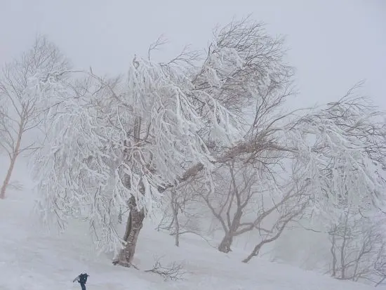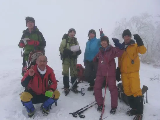 雑木に付着した海老の尻尾の中を抜けて岩峰を2つ越えて1,725mのピークに到着。ガスが出ているので小出俣山へ向かう稜線がわかりづらくて地図で確認しながら進んだ。下り始めてから、先週ごろのパーティーの踏み跡に気づいてそれに沿って進んでいった。アップダウンが2回ほどありそれを越えたら小出俣山だった。