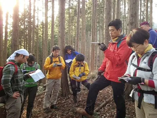 また、地図を読むときは、俯瞰して地図を見て地図上の最高点を探し出し、おおざっぱに地形を把握してイメージすること、等高線を読むことが大切だとレクチャーを受ける。本日のコースの説明を受けた後、3人一組のグループに分かれた。1グループが交代で先頭になり、先生が地図上で示したポイントへ行き、なぜそこが、地図上のポイントであるかを説明するという方法で地図読み山行が始まった。