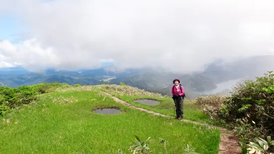 ここから山頂まではコースタイムで45分、標高差もあまりないので、お散歩気分で歩ける。途中湿原や池塘あり、トキソウやニッコウキスゲが咲いていた。ヒメサユリは残念ながら見つからない。10時30分、山頂に到着。山頂の展望は雲が上がってしまってイマイチだったが、お昼休憩とする。今日は朝から好天だったので、山頂には、かなりたくさんの人がいた。