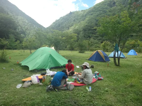 ちょうどトランスアルプスジャパンレース(TJAR)の期間で、ここが通過点だったらしく、旗を掲げたテントが張ってあった。明日の晴れを期待しながら就寝。