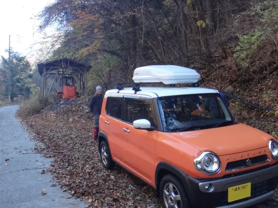 翌朝は6時過ぎに明るくなってから出発。ここから今回の取付部にたどりつくのがとにかく長いのです。東河内温泉近くの取付部まで2時間ほどかかり、下山口の井川大橋横の林道通行止めのゲート前に順三さん車をデポしてするために2台で向かいます。山行とは全く関係ないですが、順三さんの車が私と同じハスラーで、今回はじめてハスラー2台体制での山行だったので、2台ハスラーが並んでいるところを撮影して喜んでおりました。今回わかったのが、ターボ車である私のハスラーはとても燃費が悪いのです。順三さんハスラーのマニュアル・ノンターボの方がかなり燃費がいいのです。