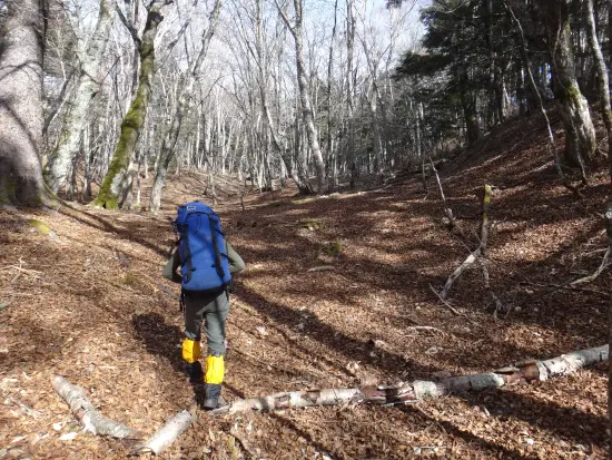 なんやかんやで歩き出しは9時になってしまいました。出だしは急坂で尾根に乗ると一気に高度を稼ぎます。まずは1,243mPを目指します。赤布のようなものは全くないルートですが、薄く獣道のようなものがついていて迷うことはないです。途中、熊捕獲用の檻がありましたが、しばらく使われていないような感じでした。1,518mPを経由して1,801mPを目指して登っていきますが、かなりザレていて斜度もかなりあるのでとても歩きづらいです。高度を上げるにつれて針葉樹より広葉樹の方が多いようで、陽射しを一杯に受けてとても暖かい中での登りとなりました。