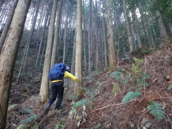 行者岳からは2万5千分の1地形図にある長沢林道に降りる登山道を行く。あまり歩かれていないようだが、所々あるテープを頼りに進む。地図にない林道に惑わされルートを見失うが、GPSなどを駆使して軌道修正、林道に出ると思しき沢を下り、何とか到着。地図では読み切れない地形があり、一筋縄ではいかないルートだったけど、皆で行けばやっぱり楽しいね。
