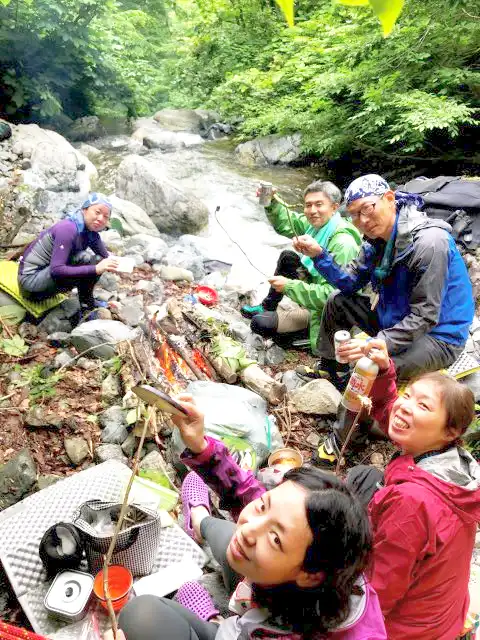 この日は登山口近くの入渓地点傍で幕を張るのみ。午前中が雨予報だったこともあり、東所沢駅10時と遅めの集合でのんびり出発。登山口駐車場に着いたころには、雨は上がっていた。入渓地点までは登山口から15分程度である。第2渡渉点のすぐ先の右側に開けている場所があり、そこを幕場とすることにした。