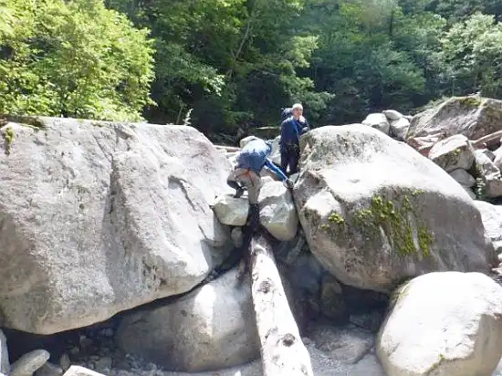 予定では3時間程度で到着してしまうので、のんびり遡行することにした。しかし、歩き始めてすぐにのんびり行ける沢でないことを思い知らされた。この沢は巨岩の急登なため、普段の河原歩きのように、丸石をポンポンと飛んで遡行はできず、巨岩に上っては下りの繰り返し。老齢者、初老者には予想に反して厳しい遡行だった。休みも頻繁に入れながらののんびり遡行。途中竿を出すが、全く反応がなかった。4時間弱で幕場についた。