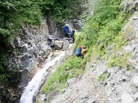今日の行程は9時間くらいと見込んで5時出発にした。前日のように急登だったが、巨岩はなく、すぐに滑床の沢となった。そのまま河原歩きを続け、大滝の手前まで来た。大滝手前の滝は左から直登できるが、一応安全のためロープを出した。が、皆スルスルと歩いて登ってきて、不要だったねと。そのあとはトイ状の激流の側面をへつって大滝の下部へ。ここも難なくクリア。大滝は直登できないため、右側のルンゼを登って、トラバースで滝の上部に出る。ロープをルンゼ中腹右側のブッシュにFIXし、滝の上部へ10mほどトラバースするが、このトラバースがいやらしい。ザレ場で手がかりがなく、滑るとそのまま大滝に落ちてしまう。慎重に足場を固め、無事にトラバースできたが、今度はロープをFIXする場所まで長さが足りず、仕方なくちょっと怪しい手前の岩にスリングを巻いてFIXした。ハッシー、バタコが無事にトラバースし、ほっとした。