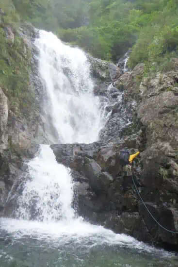 集中するためにできるだけ上に泊まりたかったので、二俣付近では幕場を探さず躊躇なく進んだ。が、二俣からすぐの2段20mの滝は予想より大分手こずった。お腹まで水に浸かった状態であれこれ試してみるが、下部はヌメリが酷くなかなか取りつくことができない。トポには「右壁を登るが容易」と書かれているというのに!なんとか離陸できた時は本当にほっとした。