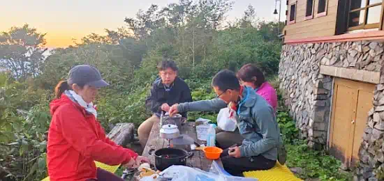 会のレジェンド(?)と呼ばれる方々との貴重なお時間を、暗くなるまで野外で楽しみました。今夜は満員の避難小屋に泊まらせていただきます。