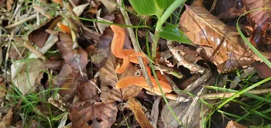 のんびりと30分ほど過ごし、小屋へ戻りました。途中、登山道の脇にオレンジ色で細長い不思議なキノコを見つけました。猛毒のカエンタケと思われます、触らないように!