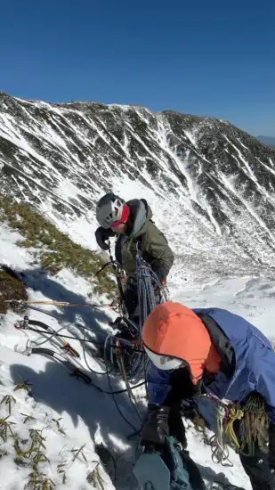 3ピッチ目、岩の上をアイゼンで歩く経験がほとんどないので恐怖感を感じながら登っていく。支点はだいぶ慣れたが足元が不安定なので順調にモタつきながら進む。ちょっとしたナイフリッジを越え、ちょうど良い岩があったので支点作り。スリングを岩にしっかりと回せたので相当強固な支点ができた。