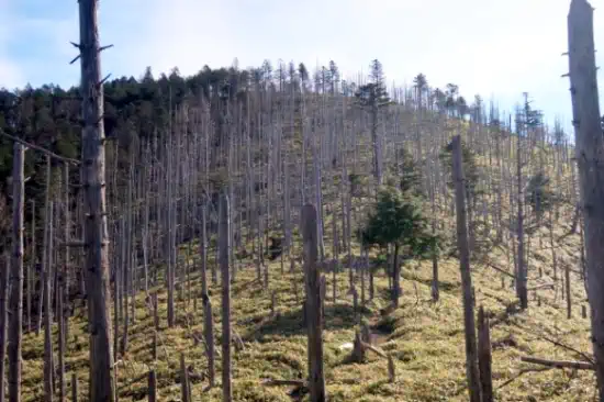 二日目は綺麗な朝焼けが見られ、今日は富士山を眺めながらのルートなのでこれは景色が期待できるとウキウキしながらスタート。苔むした樹林帯を超えると黒岳へ、さらに進むと縞枯れ現象の林が出てくる。一見寂しい感じもするが、縞枯れ現象は山の自浄作用とも考えられているらしい。