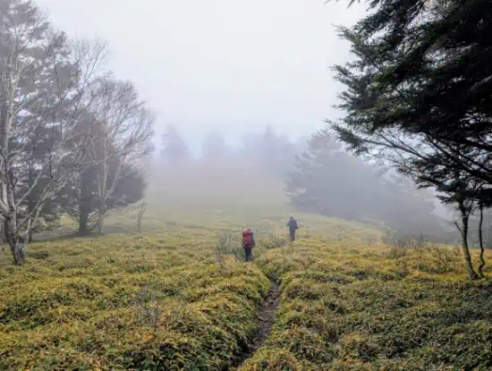 すっかりガスの中の歩きとなり景色を楽しむことはできないが、小金沢山へ続く笹原の道は美しく、高低差も殆どないので歩きやすい。