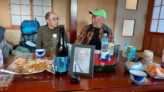食事を部屋でいただくスタイルは以前と変わっていなかった。運ばれてきた角膳は誰が指揮するでもなく見る間に大部屋に整列し飯が盛られてゆく。こういうことに皆手際が良いのは長年のテント自炊の成果か。遺影を上座に据えて食前の記念撮影。5人一列で向かい合っての夕食は思いのほか静かだった。忙しく箸を動かしているメンツを改めて眺めてみると、人間のタイプに偏りがないことに気が付く。思えば、ここに居ないメンツを含め、哲が付き合った“人種”は幅広かった。誰とでも話ができるのが哲の強みであった、と改めて思う。営業職に就いたのもそれを自覚してのことだったに違いない。