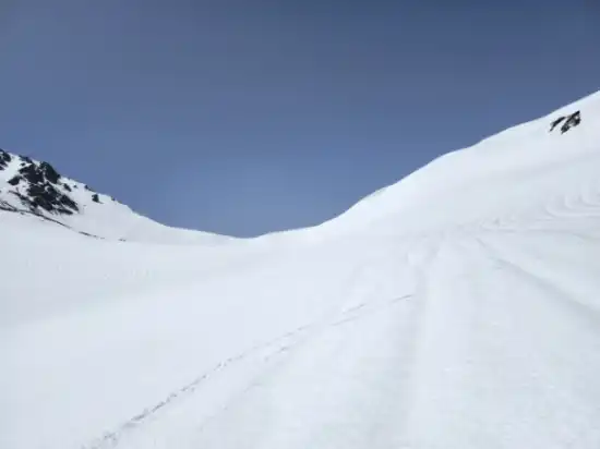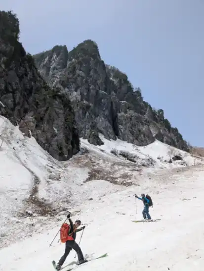 カール滑走の後は2,550m辺りの夏道を乗り越え、次なる内蔵助平に向かって滑る。雪が重くなってきたが頑張って滑って滑って内蔵助平に到着。長かった。