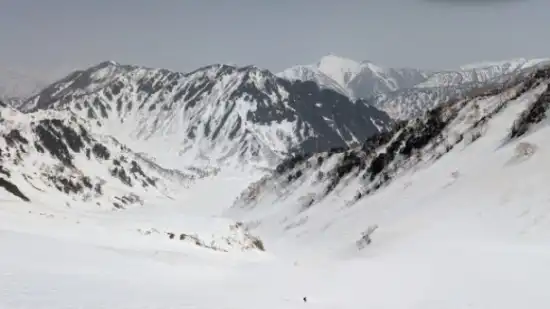内蔵助カールの滑り出しを11:00と考え、宿を7:30に出発。真砂岳を目指して大走りを登る。気温が高く雪が緩んでいてクトー、歩行アイゼン無しで稜線まで登れた。ドロップポイントの内蔵助山荘に向かう途中から晴れてきて、真っ白な内蔵助カールが現れてテンションが上がる。