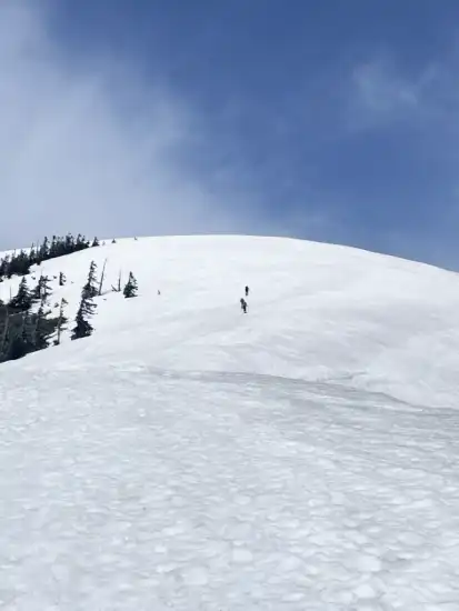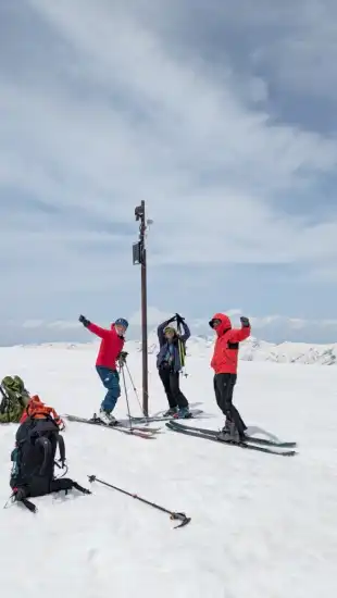 山頂で記念撮影して滑降開始。しばらくは適度な滑りやすい斜度で、雪質も良い。先行の2人組のトレースを追って、登ってきたルートを少し左や右に巻く形で滑ると、ほぼ登りなしで大白沢山手前まで滑ることが出来た。そこからジャンクションピークまで最後の登り。