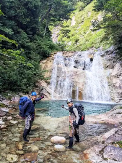 前夜はいつもの道の駅。ワイルドフィールズおじかの手前の林道路肩に車を一台デポする必要があるので道の駅を4時半に出発する。デポ後に大蛇尾林道を進み、送電線を横切るあたりの広場に駐車してそこから歩き始める。大蛇尾林道は事前情報で結構荒れているとのことだったので、だいぶ手前に止めたが、実際はそんなに悪くなかったのでもっと奥まで入っても問題なさそうだ。駐車できるスペースはところどころにある。リーダー(私です)がぎっくり腰明けで初めての本格的な沢登りということもあり、こまめに休憩を取りつつ、ゆっくりゆっくり歩いて2時間半ほどかけてようやく吊り橋に到着し、ここから入渓する。陽の光を浴びた清流は圧倒的な透明度でキラキラと輝いており、メンバーのテンションは最初からマックスとなる。更に2時間弱で二俣となり、我々は左手の西俣へと入っていく。すぐにヤギ滝が出てくるが西俣はここが魚留めとなる。今日の水量ならヤギ滝は十分登れそうだったが、メンバーのクライミング力と時間を考慮して当初の予定通り左岸より巻いて越える。滝の上は夢にまで見た(ちょっと大袈裟かな?)大蛇尾ブルーの始まりだ!